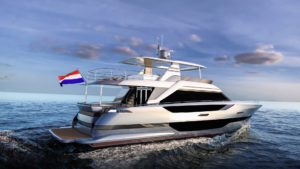 A 24m (88ft.) modern flybridge design by Cor D. Rover, Van der Valk will soon build one in aluminum with triple Volvo Penta IPS1050 engines. The yard says it “will set new standards in terms of ease of operation and even single-handed cruising.”