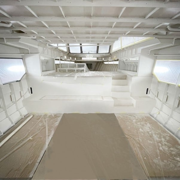 We zien een stalen casco met veel volume en daaruit valt af te leiden dat het schip een riant interieur krijgt, met een verhoogde stuurhut. Eerder vertelden de broers Bastiaan en Louis Jousma: “Met Project 54 hebben we goed geluisterd naar onze klanten en gekeken naar recente ontwikkelingen in de jachtbouw en daarbuiten. Mensen zijn aan steeds meer luxe en comfort gewend. Thuis, maar ook op vakantie. Dat vertalen we nu naar een nieuw topmodel. Uniek aan Project 54 is de indeling waarmee het beste van een achterkajuit- en een open kuip-jacht wordt gecombineerd.”