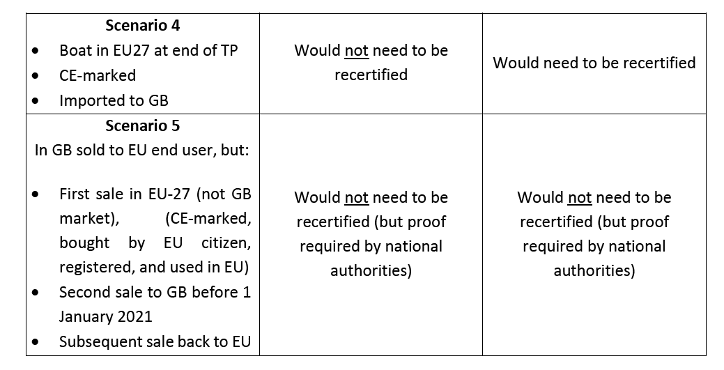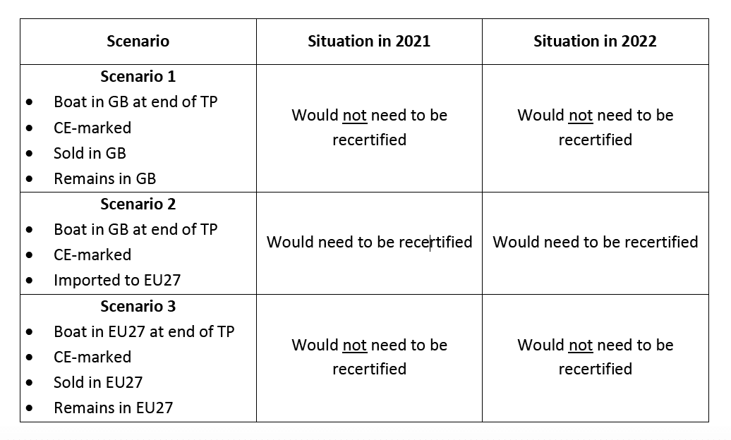Below are the scenarios for second-hand boats that are covered by the EU’s Recreational Craft Directive and the UK’s Recreational Craft Regulations. In cases where recertification would be required, a Post-Construction Assessment (PCA) will have to be completed. This applies from the end of the transition period (TP) on 1 January 2021.
