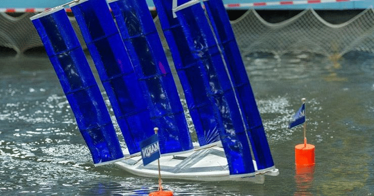The 2018 edition was a contest for 13 teams of students from Delft University of Technology and Rotterdam Mainport Institute. The former’s ‘Chit-Chat’ team took top honors. Its design (above) of a large sail plan of 3 wing sails was fastest, especially on broad reaches. And its wing sails on an aero-rig made it very maneuverable when close-hauled.