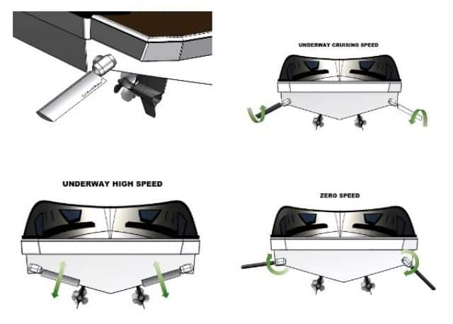 Their MagnusMaster stabilizers go on yachts up to 30m and doing between 3 and 12 knots. Their patented AntiRoll, the dual-axis stabilizer for superyachts, is the basis for the AntiRoll All-in-One. When the yacht is stationary, the fins make a flapping motion. At cruising speed, they rotate but their ‘high aspect’ shape generate far less resistance than traditional fins. What is new is that the addition of high-speed stabilization makes the All-in-One truly multifunctional. At high speeds, the fins fully retract behind the transom. From there, the fins can both trim and dampen the rolling and swaying of the yacht.