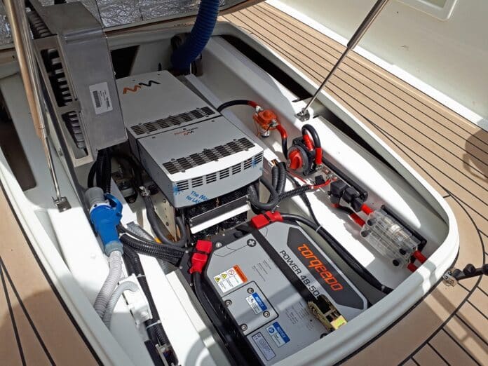 Marcel Schaap van De Stille Boot vult aan: “Onder de motorkap staat een WaterWorld elektromotor van 15 kW, waarmee deze AdmiralsTender ook waterverplaatsend mooi vaart. Met 16 km/u komt hij boven de rompsnelheid en dat is dus een stap sneller dan je zou verwachten. De elektromotor is gecombineerd met drie Torqeedo lithium accu’s van 5 kW elk, dus in totaal 15 kW. Goed voor een volle dag varen. Met de snellader zijn de accu’s in een paar uur te laden.