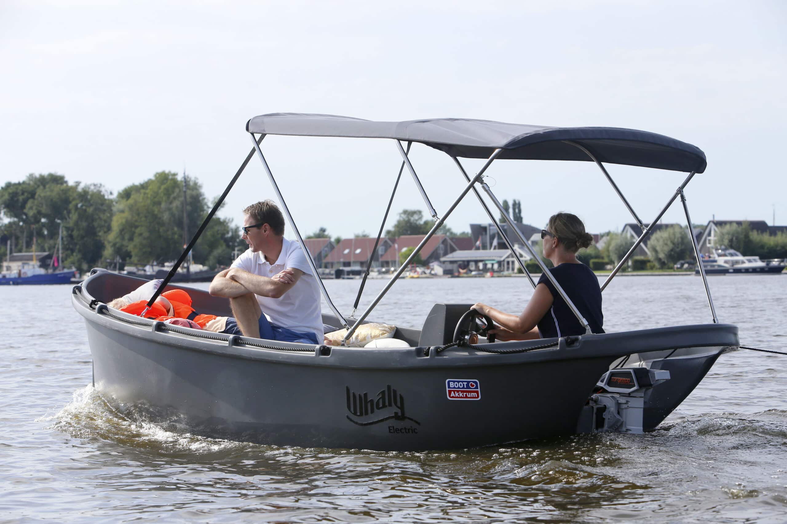 Een elektrisch aangedreven sloepje van Whaly met een Torqeedo elektrische buitenboordmotor.