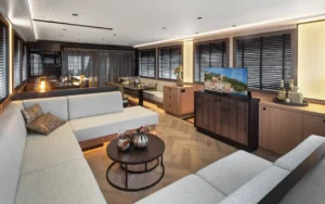 The Flybridge has retained the sporty character and dynamic look of the Xtreme 78 Sport and has a large inside volume. Below deck, amidships is the owner’s cabin plus two double VIPs and one guest cabin. The deck-level salon forms a whole with the steering cabin.