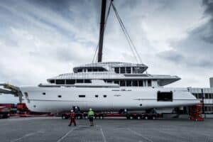 With Moonen personnel looking on, Kokoro was lowered into the water at the Moonen yard.