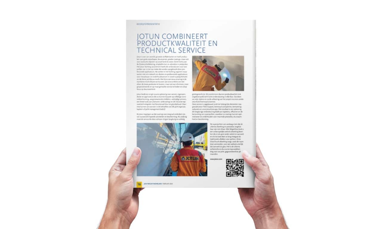 Jotun is een van werelds grootste verf abrikanten en heeft producten voor grote zeeschepen, bouwverven, poeder coatings, maar ook voor iconische objecten op zowel land als water. Denk hierbij aan de Oosterscheldekering, olieplatformen en attracties in pretparken. Het Jotun Yachting assortiment heeft alle verfproducten voor luxe jachten van 10 tot 190 meter die worden aangebracht door professionele applicateurs. We werken in het Yachting segment nauw samen met ons netwerk van dealers en professionele applicateurs voor nieuwbouw- en onderhoudswerven in zowel superjachtmarkt als de kleine jachtbouw markt. Met bijna een eeuw ervaring in de maritieme markt blijven we bouwen aan onze ambitie om niet alleen de beste producten te leveren, maar ook een slimmere, meer gespecialiseerde en op maat gemaakte service te bieden en volop focus op duurzaamheid.