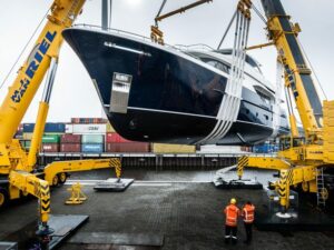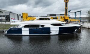 “The launch, exactly on schedule, marks a proud moment for everyone who has worked on the Moonen 110,” he added. “Her construction has progressed precisely as planned. We’re very happy with her elegant blue hull. She looks perfect in the water.”