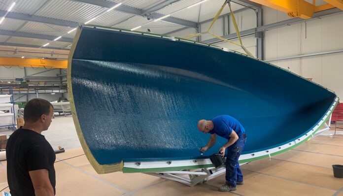 Bij de Jachtwerf Heeg wordt hard gewerkt om de nieuwe Pointer 30 vaarklaar te maken. Het kieljacht wordt in eigen huis gefabriceerd, – de productiehal is vorig jaar uitgebreid -, en verkeert in de afbouwfase. Op bijgaande foto is een eerdere productiefase te zien: de rompmal met de gelcoat in de kleur van het eerste exemplaar.