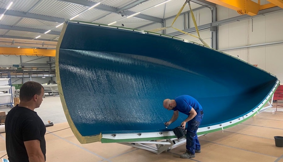 Een eerdere productiefase van de Pointer 30: de rompmal met de gelcoat in de kleur van het eerste exemplaar.