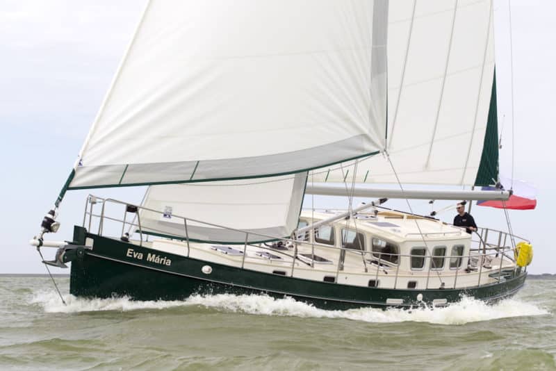 The yard’s steel-hulled Enksail NK yachts range in length from 40 to 60 ft. Buyers can opt for a hydraulic keel to achieve variable draft. The cutter-rigged, semi-custom yacht can be easily sailed by 2 people, has disproportionately much interior space for its length and features a characteristic straight-up, boxy saloon that provides 360-degree outside views.