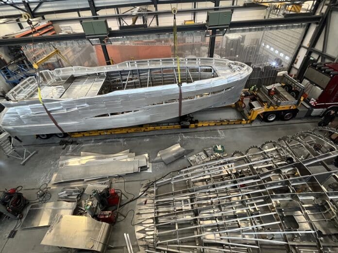 Eerder dit jaar leverde Habbeke Shipyard deze aluminium romp aan Van den Hoven. Foto HS