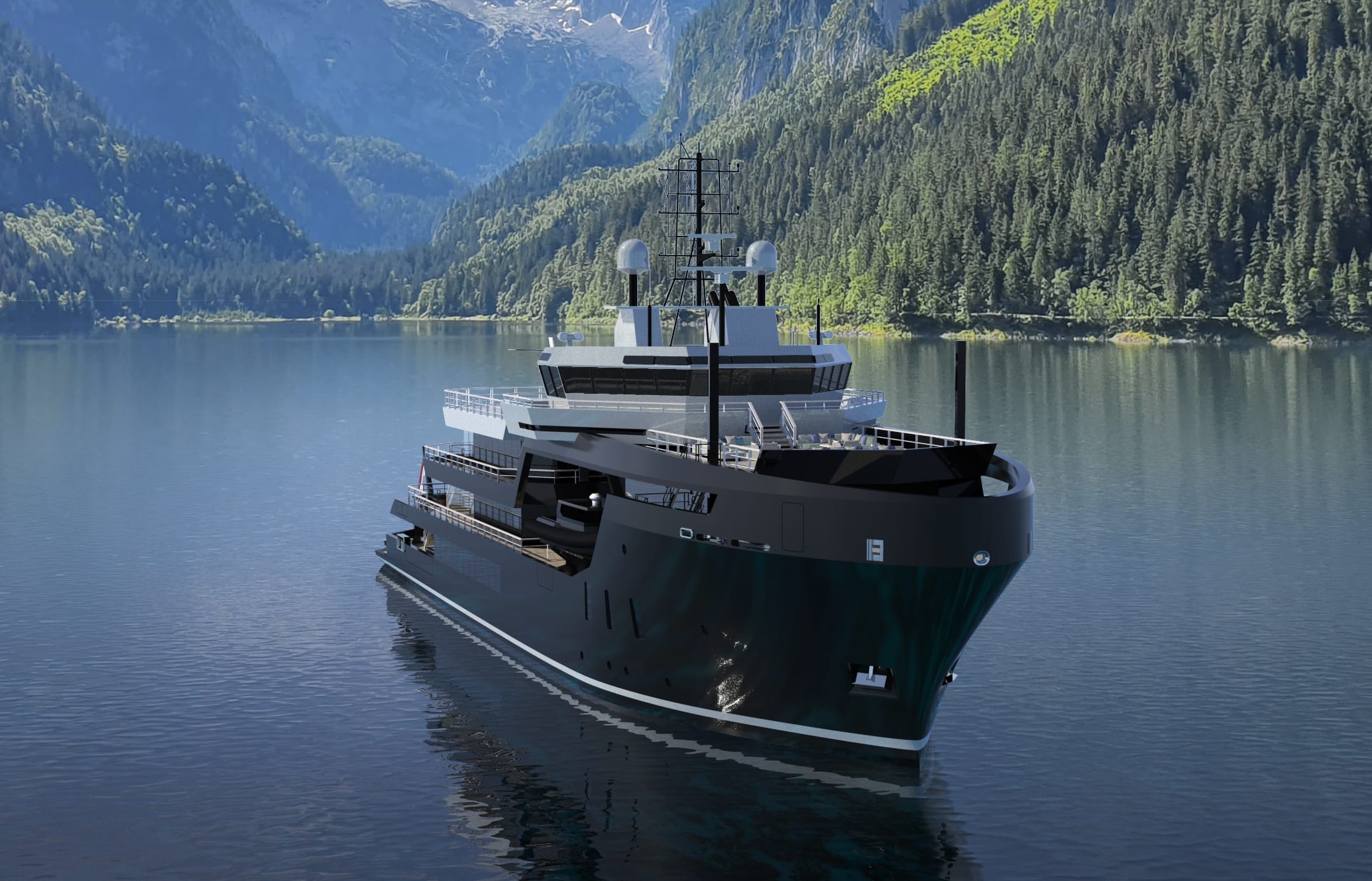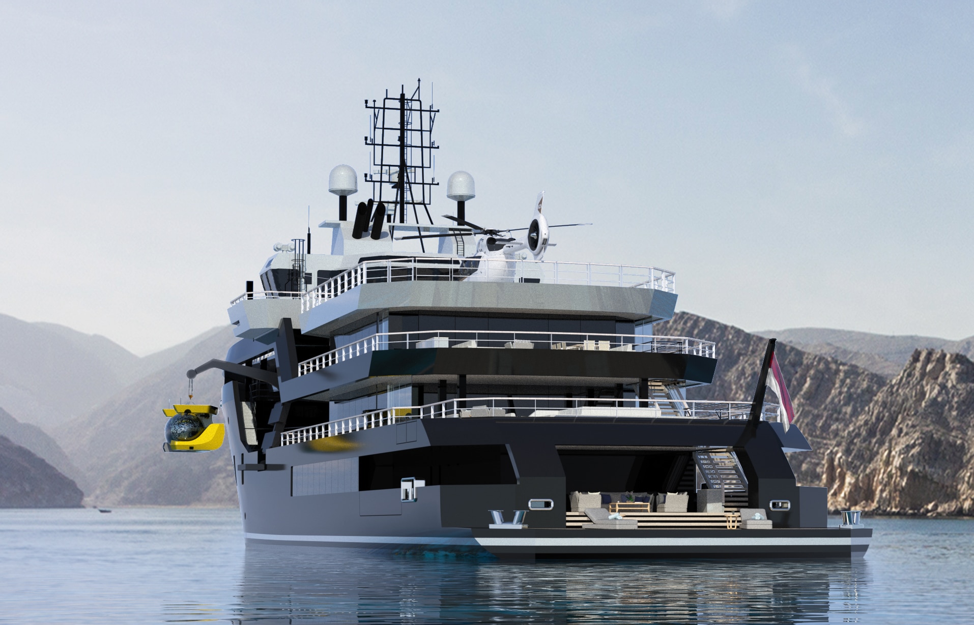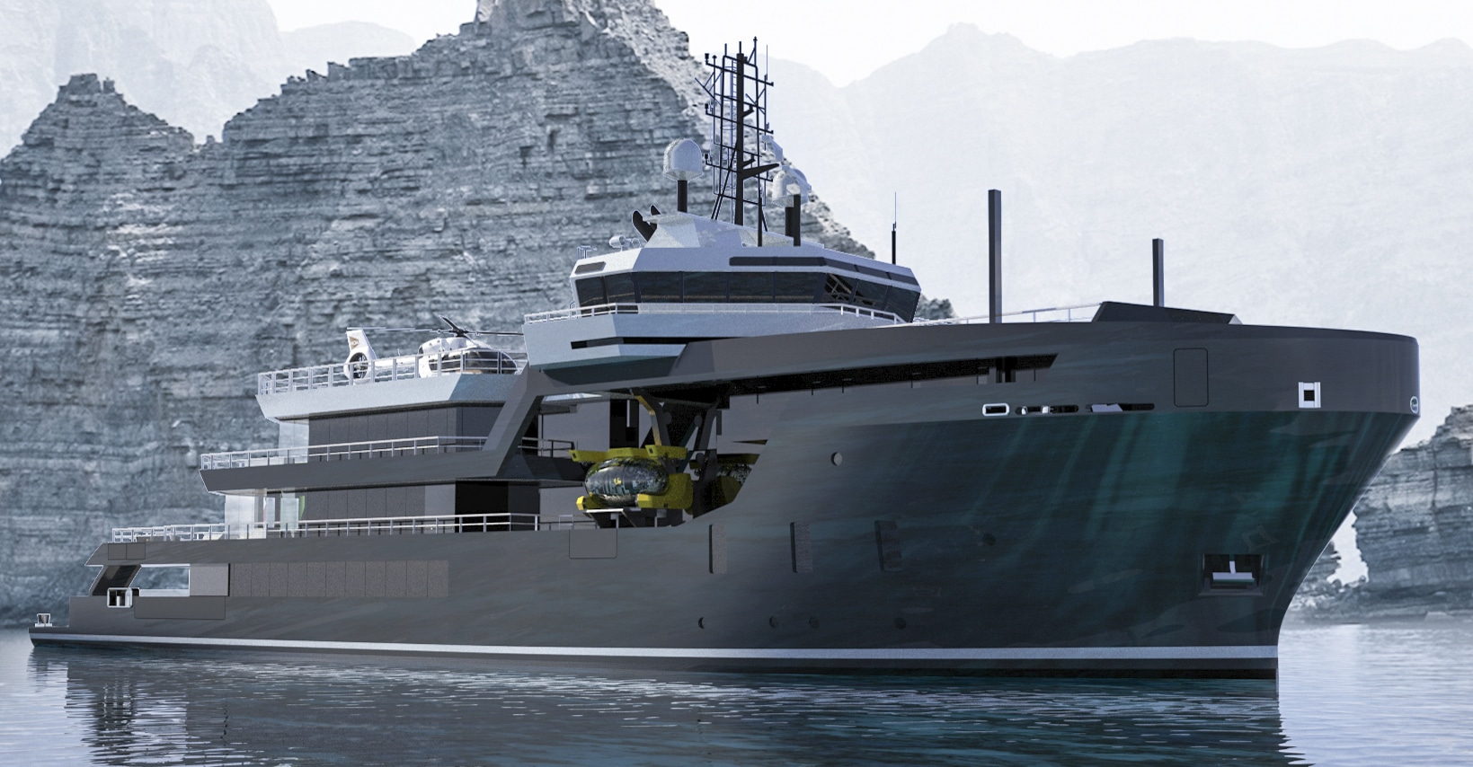 In een grote garage kan het ‘speelgoed’ voor expedities, denk aan duikbootjes en tenders, worden opgeslagen en met kranen aan weerszijden te water worden gezet. Het volledig gecertificeerde helikopterdek kan ook als entertainmentplatform dienstdoen, met meer dan 200 vierkante meter buitenruimte. De hoofdsalon heeft ramen van dek tot plafond.