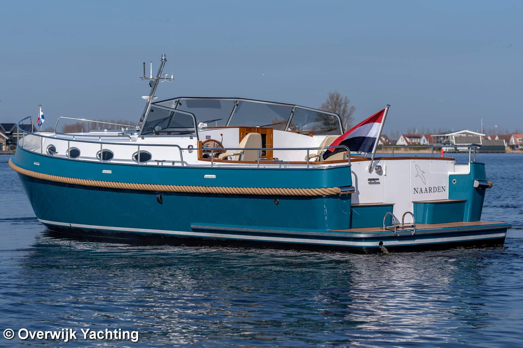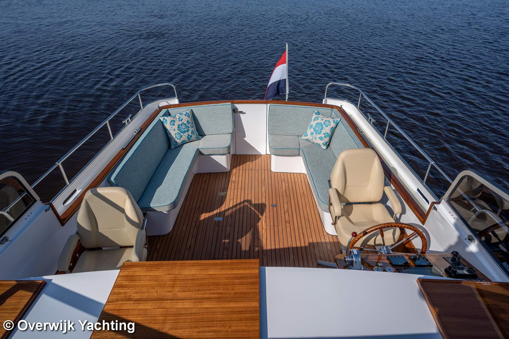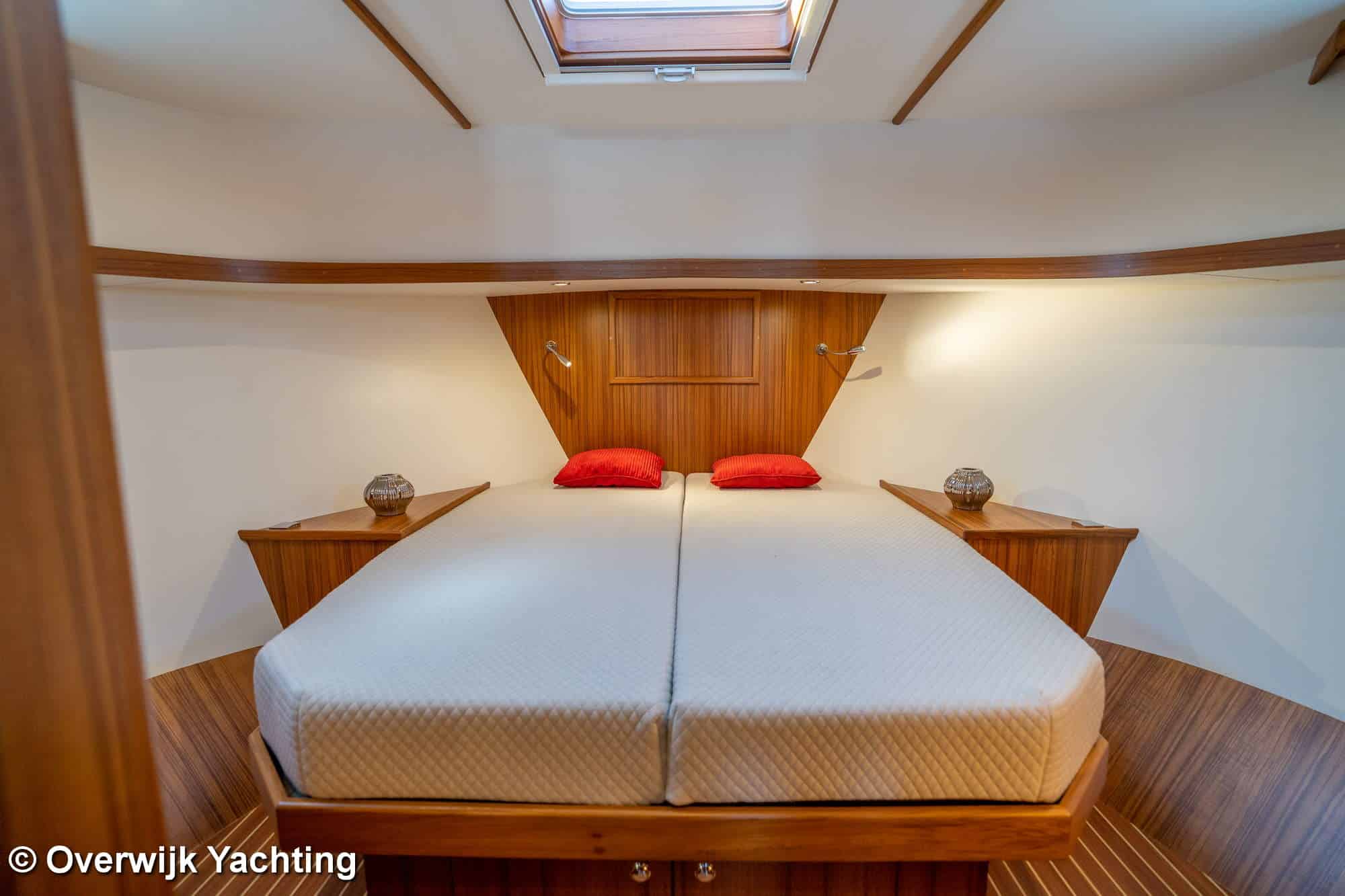 Het luxe multiknikspant jacht heeft de traditionele en tijdloze uitstraling van zijn kleinere voorgangers, maar biedt met een breedte van 4,24 meter en stahoogte van 2,10 meter veel meer ruimte. De meest ingrijpende innovatie bevindt zich onderdeks. “In dit model is naast de gescheiden badkamer en toiletruimte ook een eigenaarshut met vrijstaand bed gerealiseerd”, aldus Homme Overwijk, eigenaar van Overwijk Yachting. “De breedte van de boot biedt ons en de klant enorm veel mogelijkheden en we kunnen dan ook aan veel wensen van de opdrachtgevers voldoen.”