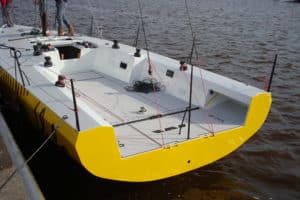 Key among them: the Waarschip, a multi-articulated chine keel boat, the first of which was built in the Dutch town of Waar in the 1960s. DIY-ers could get it semi-finished. They were also built under license, for instance by Denmark’s Dantec Marine. At least 3 Waarschip generations have been built. Recently, Peltzer began a new one: an 11m.Waarschip-36 (left) for the 2018 World Championships, fully optimized for IRC and ORC handicaps. Its red cedar hull strips are covered by glass-fiber and epoxy for stiffness and strength. The built-for-speed boat weighs under 1200 kilos (2645 lbs.), has a flush deck and a forward helm.