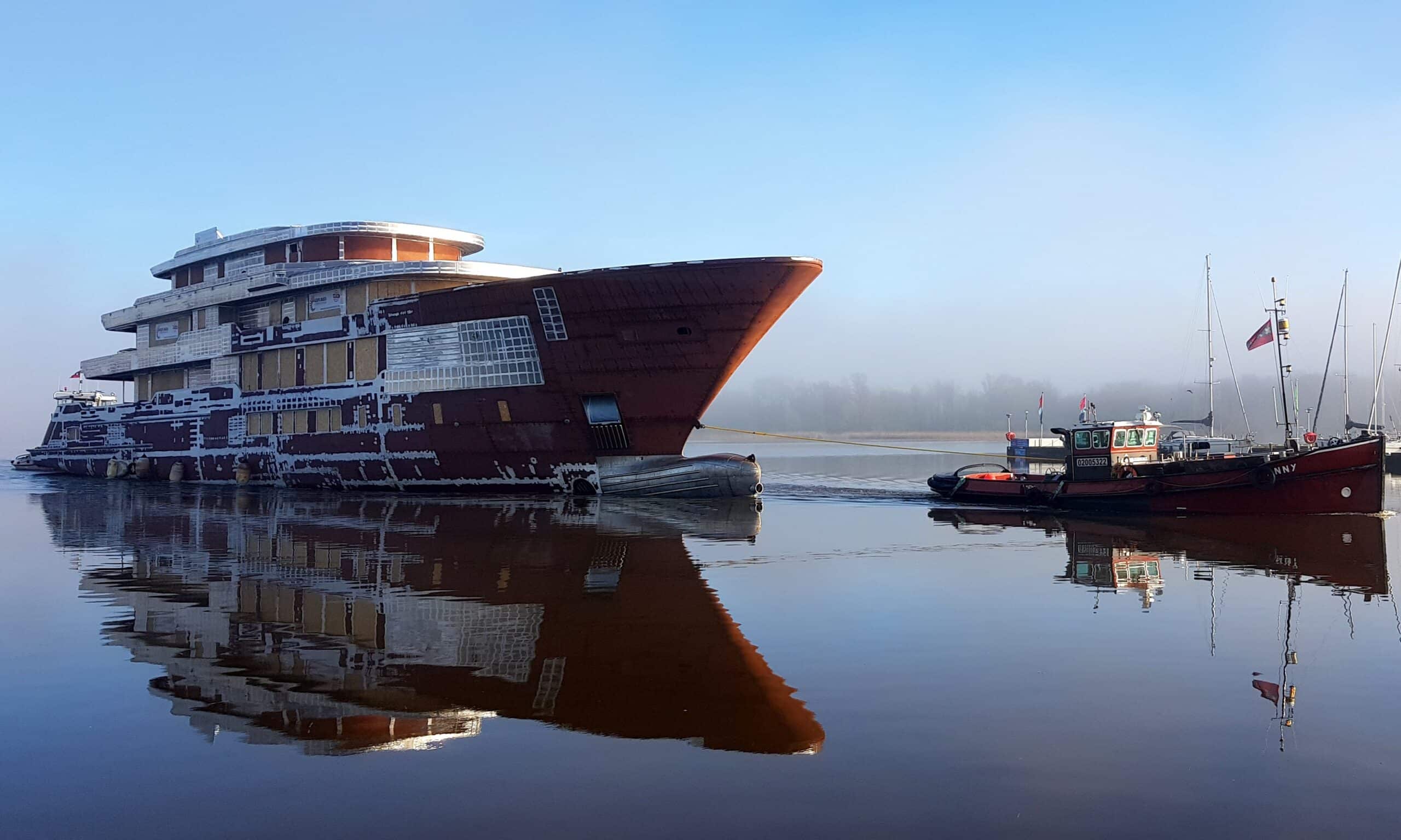 Zonder daar op uit te zijn, maakte Evert Stel* vanaf zijn schip Meander V deze mooie nieuwsfoto. Het casco van 65 meter lengte, gebouwd door Gebroeders Buijs Scheepsbouw in Krimpen aan den IJssel, is via de Gouwzee op weg naar Royal Hakvoort in Monnickendam. Daar zal het als project YN254 worden afgebouwd. De werf kondigde op 18 januari 2022 de order aan voor een nieuwbouwproject van 65 meter, het grootste dat Royal Hakvoort tot nu toe heeft gebouwd. Het is in nauwe samenwerking met de internationale jachtmakelaar Fraser verkocht aan een vaste klant. Het interieur en exterieur komen van de tekentafels van Sinot Yacht Design. De scheepsarchitectuur, constructie en technisch ontwerp worden verzorgd door Diana Yacht Design. Het 65 meter lange superjacht heeft een forse breedte van 11,60 meter en een volume van 1.435 GT. De oplevering staat gepland voor 2025.
