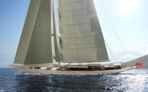 Dykstra Naval Architects CEO Thijs Nikkels said the yacht was also given a different bow. It received a new mast in a different position and a new sail plan to retain overall balance. The yacht’s S-frame could not be changed. The yacht is now being finished at the Istanbul yard. Its interior is a deVosdeVries design. It is still called Rainbow II. The yard says it can accommodate 12 guests and a crew of 9.