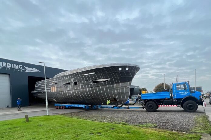 Ruim een maand na het kantelen heeft cascobouwer Smeding Jachtservice in Dronrijp de romp van de Steeler Ocean Explorer op 27 oktober opgeleverd. Dat is snel gezegd, maar er kwam wel een aantal partijen in actie voor de verdere stappen in de ketenproductie. Het 22 meter lange schip werd door Walinga Transport in combinatie met Shipyard Lemmer naar het naburige wallekant getransporteerd, waar een mobiele kraan van Dick ten Klooster de Steeler te water liet. KB Maritiem koppelde de romp vervolgens voor de sleepboot Anne J en als duwstel ging het naar Multiship Harlingen. Daar volgt straalwerk en conservering, alvorens de afbouw begint bij Steeler Yachts in Steenwijk. Zomer 2024 moet het jacht in de vaart komen.
