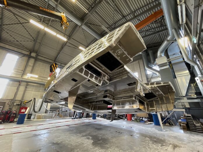Het is altijd weer een gedenkwaardig moment in de jachtbouw: het keren van een casco. Ook een moment waarop je je realiseert dat ‘kraandrijven’ een vak apart is. Zeker binnen in een hal, waar de hijsmarges gelimiteerd zijn. Medio april werd bij Gouwerok in Aalsmeer met succes het aluminium casco gekeerd van de R4 catamaran van Vaan Yachts. Daarmee is een volgende bouwfase bereikt van het 42 voet lange schip. De afbouw doet Vaan Yachts in eigen beheer, uiteindelijk in Hellevoetsluis.