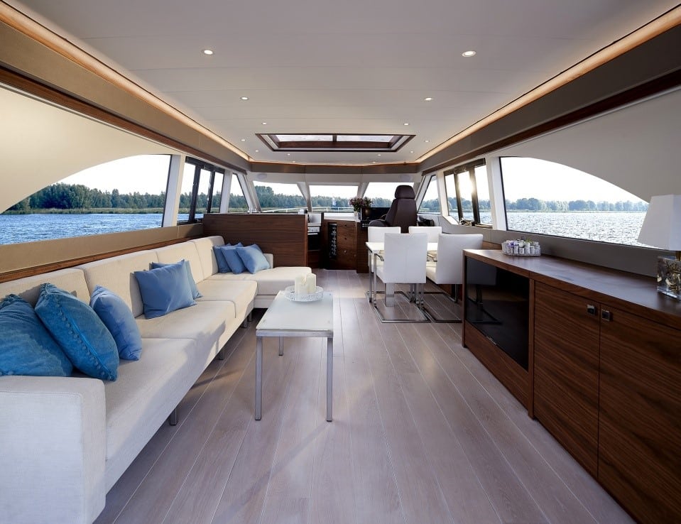 The Van den Hoven Executive 1850’s interior stands out for its mix of space, light, comfort and appearance. The aft deck, saloon, galley and steering position are on the same level. Its newly designed windows offer 360-degree views.