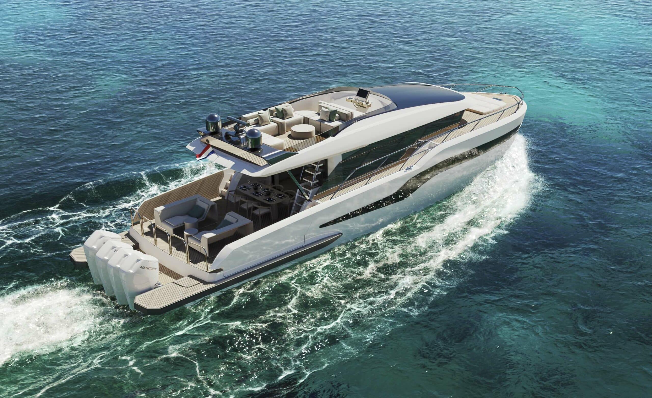 De diepgang bedraagt slechts circa 90 centimeter, ideaal voor de ondiepe wateren rond de Bahama’s, die vanuit de thuishaven in Florida bereikt kunnen worden. De voortstuwing wordt geleverd door vier Mercury V12 Verado’s van elk 600 pk, goed voor een topsnelheid van ruim 40 knopen. Algemeen directeur Bram Kooltjes van Van der Valk licht de motorisering toe: “Dankzij de nieuwe automatische schakeltechnologie van Mercury Marine komt het totaalgewicht op iets meer dan 30 ton, met behoud van de wensen van de eigenaren voor het in- en exterieur. Benzinemotoren zijn nog steeds algemeen geaccepteerd in de VS en dit project zal bewijzen dat het mogelijk is om een hoogwaardig aluminium jacht van Nederlandse kwaliteit met dit type voortstuwing aan te bieden.”