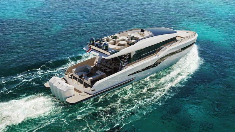 NASSAU – Dutch superyacht builder Van der Valk Shipyard has just completed sea trials with its fast 20m Edge 65 that boasts a striking propulsion setup: four Mercury Verado 12-cylinder outboards of 600 HP each for a forty knot top speed.