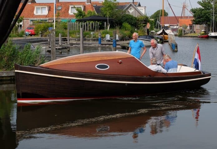 Op de komende Boot Holland in Leeuwarden zal ook de Werffboat 24 ‘Petronella’ te zien zijn. Bij de SEFFF (Stifting foar Elektrysk en Fossylfrij Farren yn Fryslân) op stand 4114/4115. Gebouwd door Roelof van der Werff en Henk Bergsma bij Scheepstimmerwerf De Hoop in Workum. Het is een elektrisch aangedreven boot van 7,15 meter lengte, met kleine kajuit. Niet alleen qua vormgeving een blikvanger; ook de bouwwijze is bijzonder. Jachtbouwer Roelof van der Werff paste 3D gevormde houten segmenten toe voor de romp. De panelen werden voorgevormd bij Curve Works in Alphen aan den Rijn en daarna in Workum – precies pas – tegen de spanten van het schip geplaatst. De romphuid is bovendien voorzien van bewerkt bamboe. Dat materiaal is in de fabriek met stoom verhit tot 200 graden, waardoor het verhardt, en een donkere kleur krijgt.