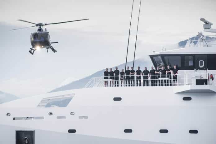 De bemanning is aangetreden aan dek bij de oplevering van de Game Changer door Damen Shipyard. Foto Tom van Oossanen